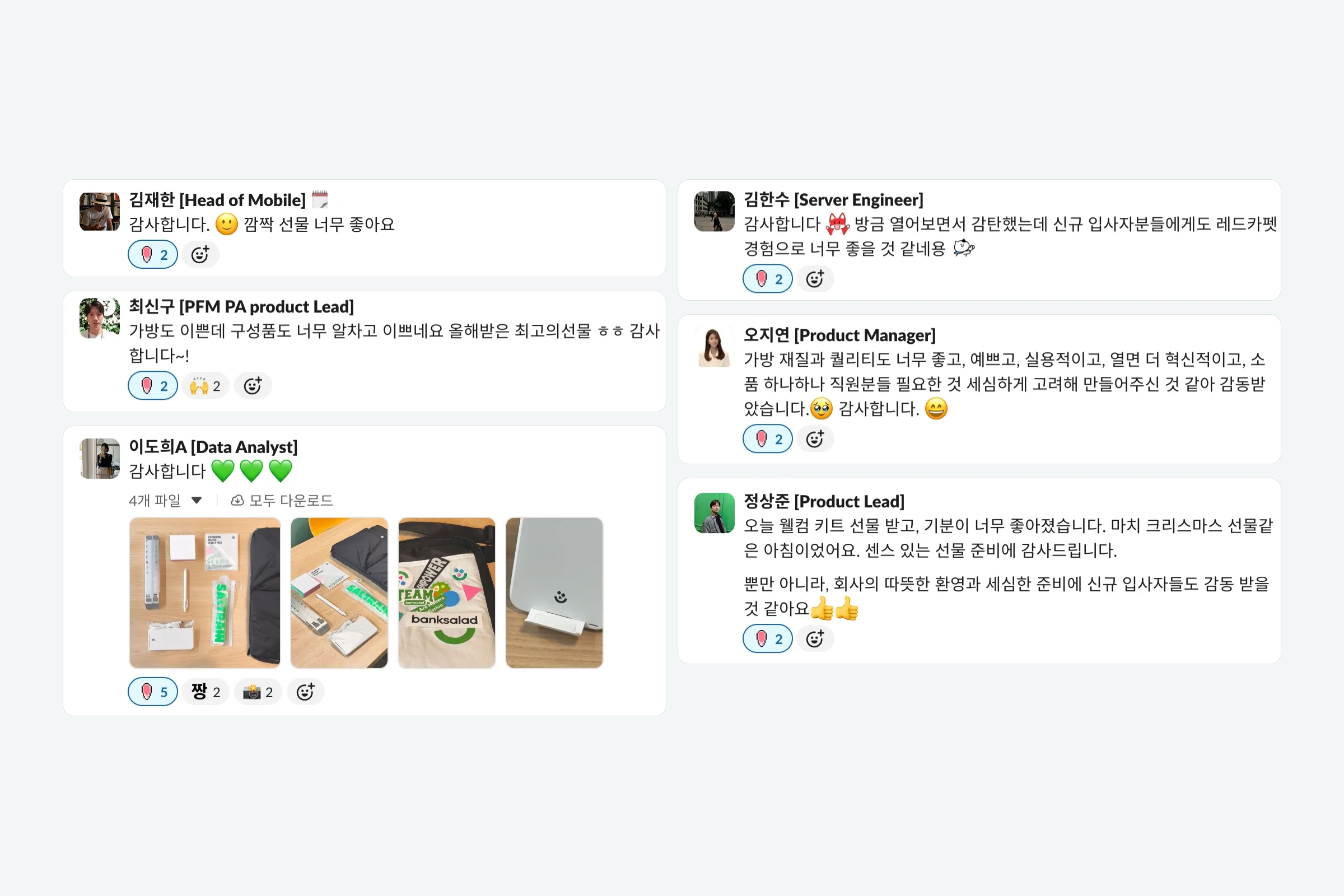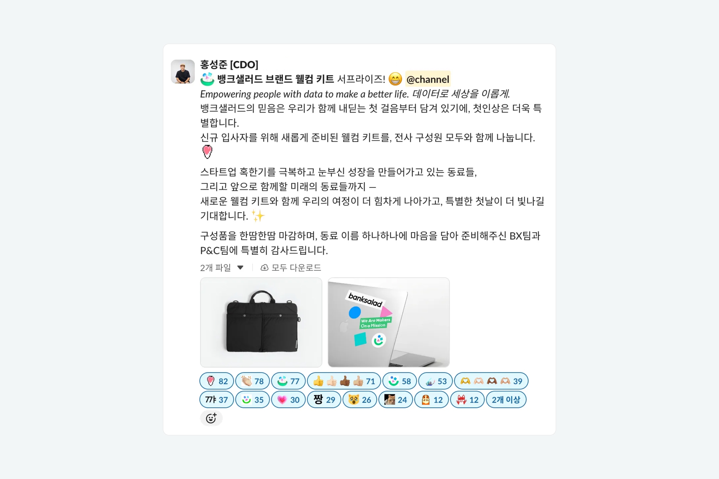 웰컴키트는 신규 입사자를 위한 물건이지만, 그동안 웰컴키트를 받지 못했던 모든 구성원에게도 동일하게 전달했는데요. 키트가 전달되던 날, 슬랙과 사내 채널을 통해 많은 구성원들로부터 긍정적인 피드백을 받을 수 있었습니다.