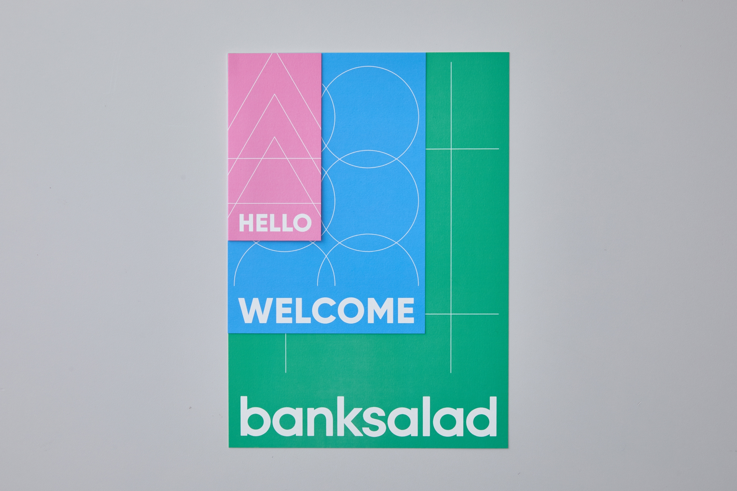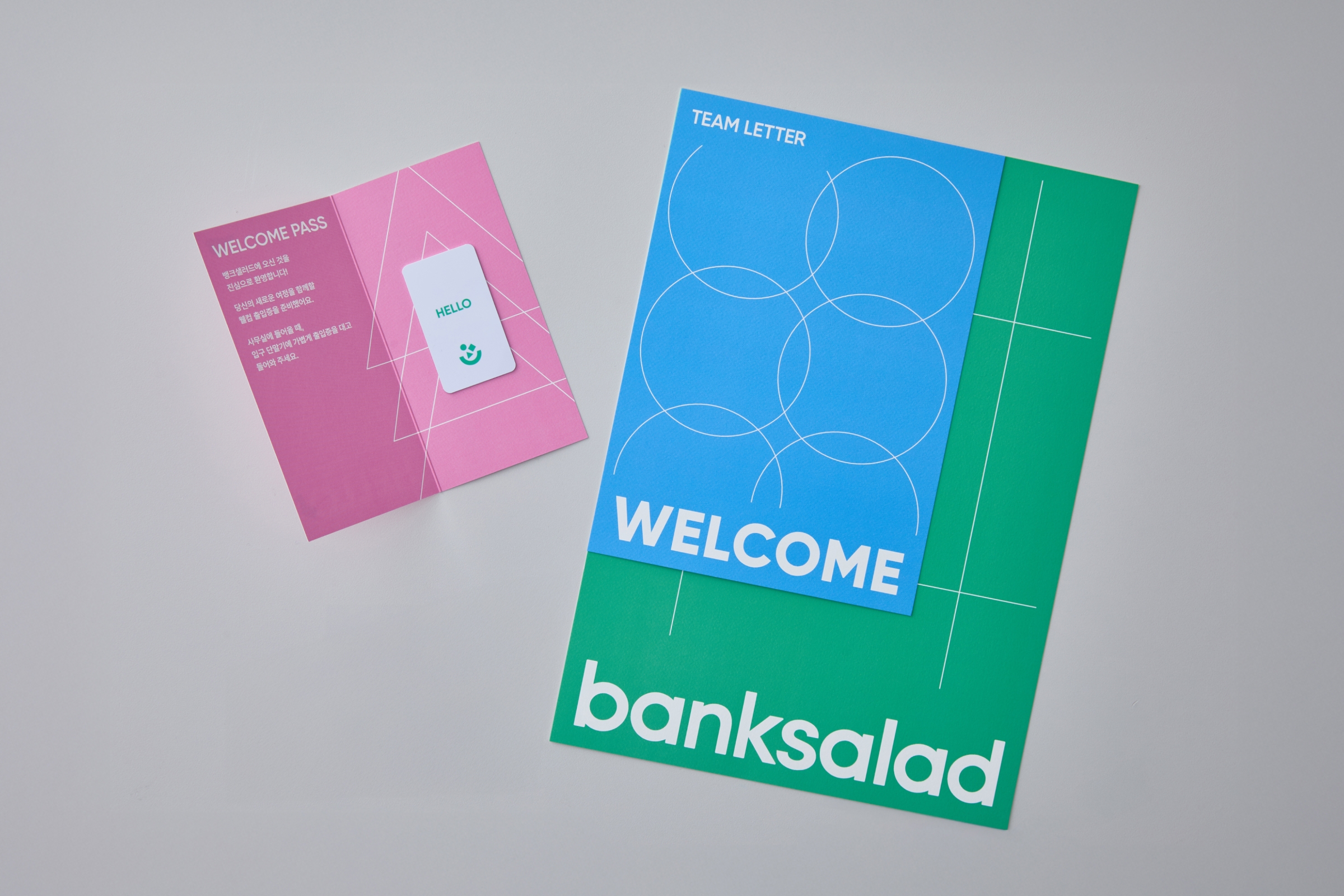 출입증 커버, 팀원들의 환영 메시지, 온보딩 가이드를 담은 서식까지 한데 모아 흐름이 자연스럽게 이어지도록 정리했습니다. 또 각각에 그린, 핑크, 블루 그리고 원형, 삼각형, 사각형 등의 뱅크샐러드의 브랜드 컬러와 심볼을 담아, 세 장이 함께 놓였을 때 더욱 살아나도록 했습니다.