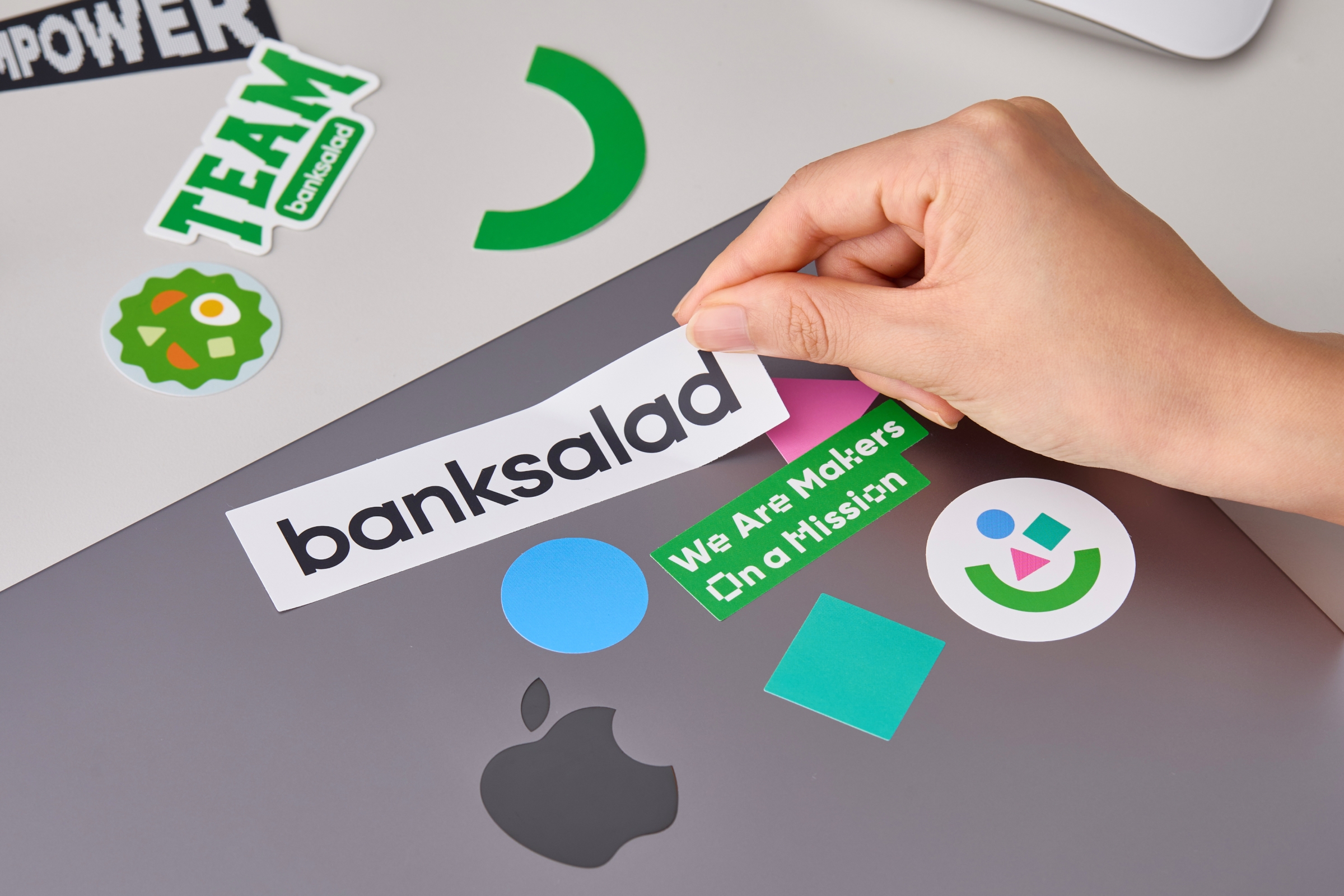 특히 이번 스티커팩은 뱅크샐러드의 로고와 슬로건뿐만 아니라, 다양한 색감과 형태의 그래픽들로 가득 채운 다채로운 디자인이에요. 여기에는 뱅크샐러드 서비스의 본질을 담고 싶은 마음도 있었답니다. 흩어져 있는 수많은 금융 데이터를 한데 모아 ‘나만을 위한 샐러드’처럼 보여주는 우리의 서비스처럼, 다양한 스타일의 스티커를 입사자분들이 각자의 개성대로 자유롭게 조합해 보길 바랐거든요.