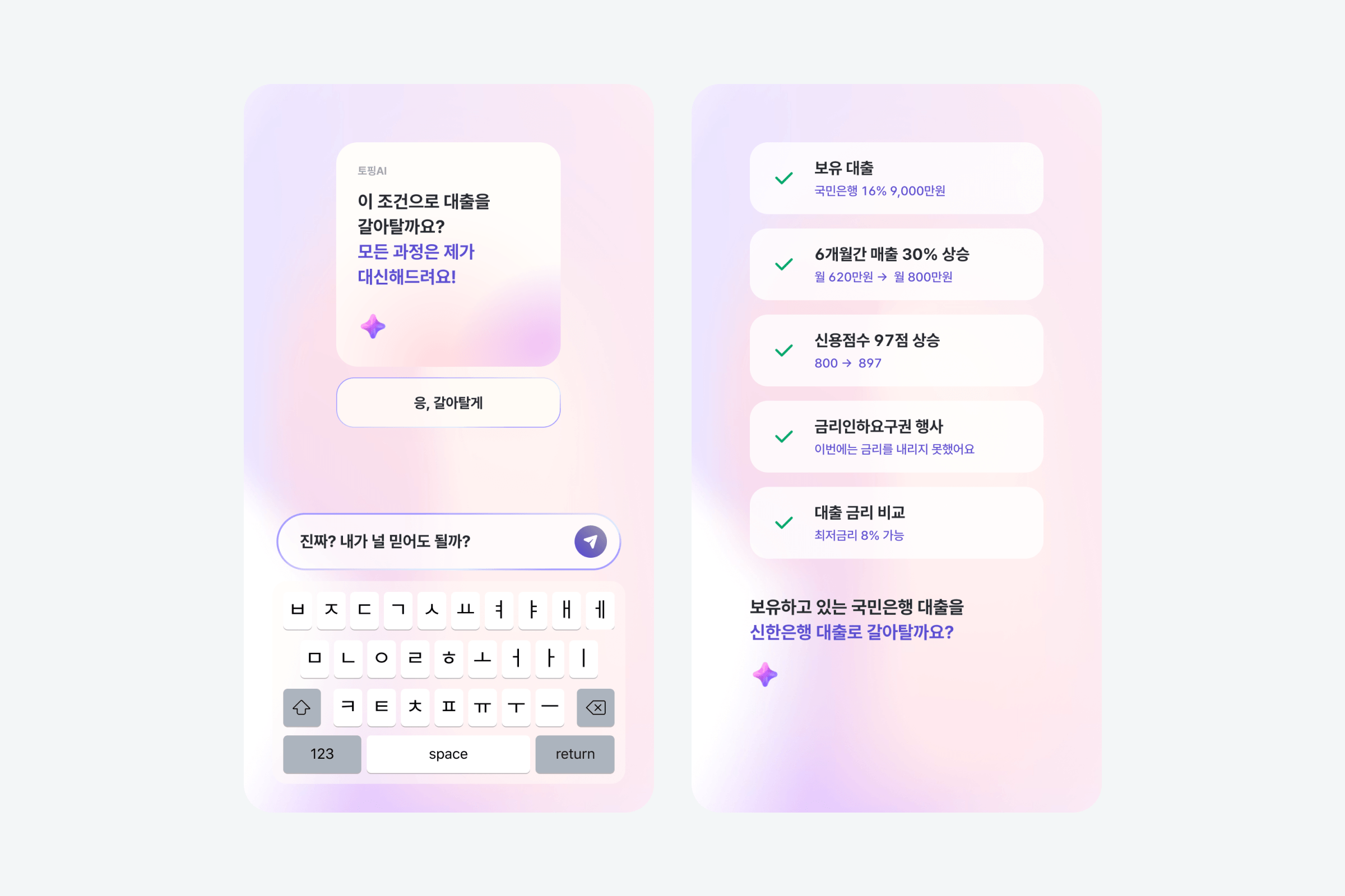 “요즘 장사해도 남는 게 없어, 도와줘!” 라는 금융 문제를 토핑+에 입력하면 최적의 시기에 이자를 절감해 주는 솔루션을 바로! 제안합니다. ‘갈아타기’ 클릭 한 번으로 자동으로 대환을 위한 과정이 실현되고, 정부지원사업까지 스스로 찾아주고 신청같은 복잡한 과정까지 대신 실행해줍니다.