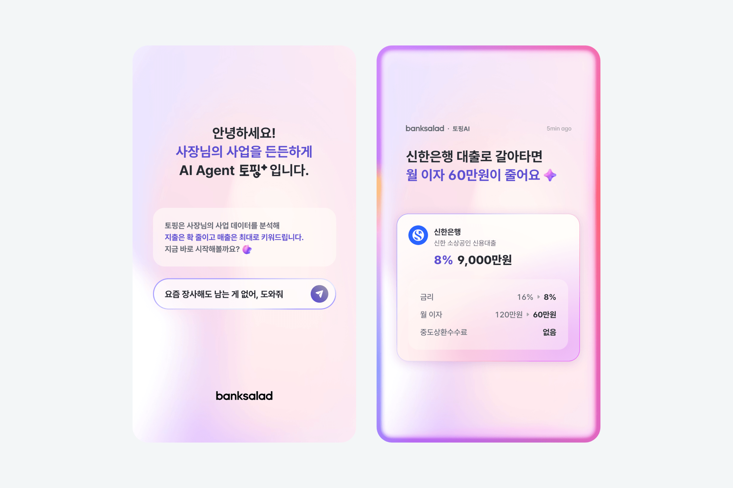 <관련 기사보기> “토핑아, 장사해도 남는 게 없어 도와줘” 뱅크샐러드, 소상공인의 동반자 ‘AI 에이전트’ 선봬